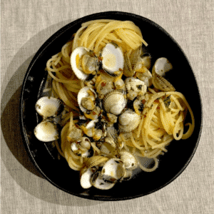 - Cuire les pâtes » al dente » et ajouter de l’eau de cuisson des pâtes quand les coquillages s’ouvrent…